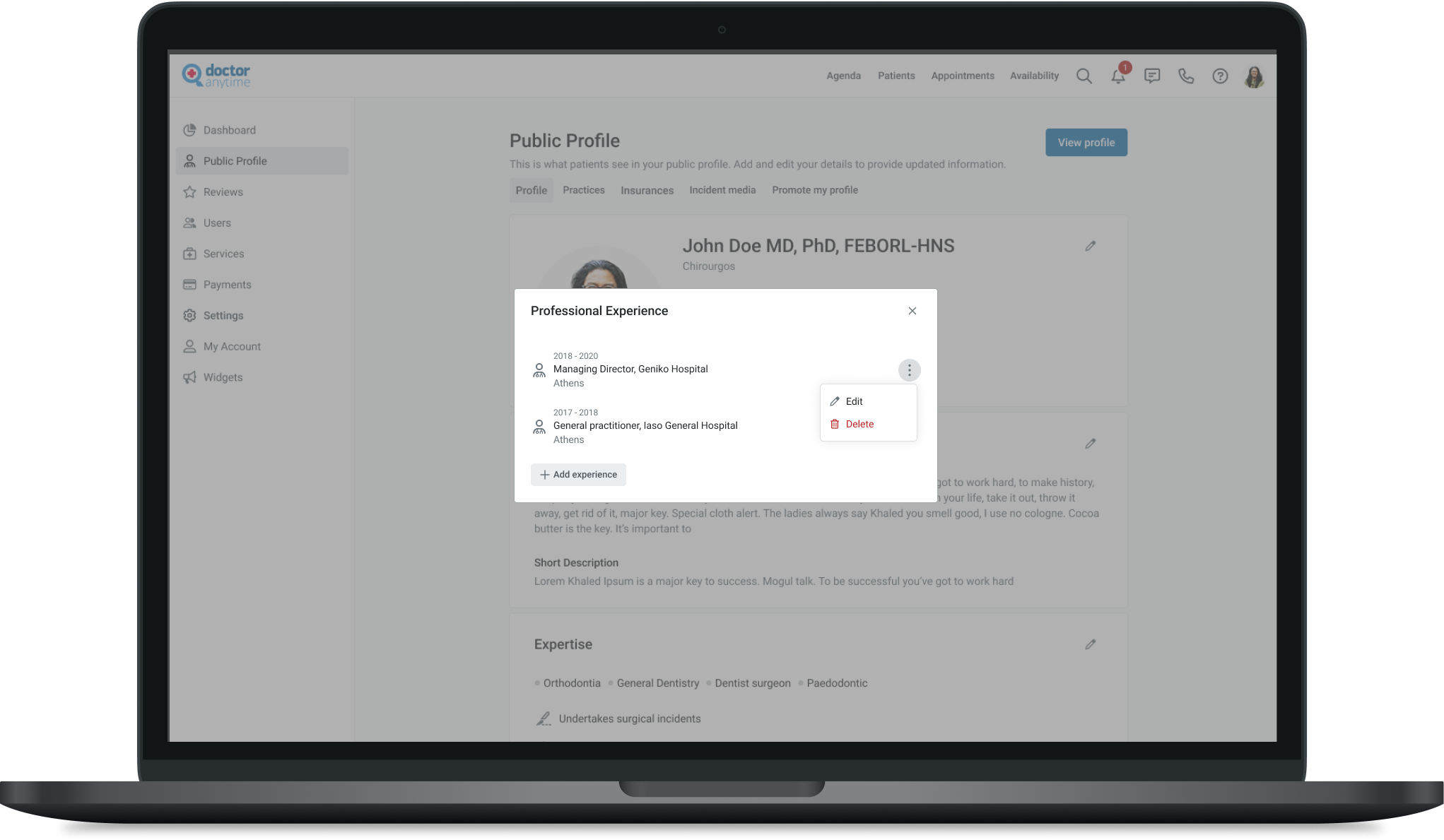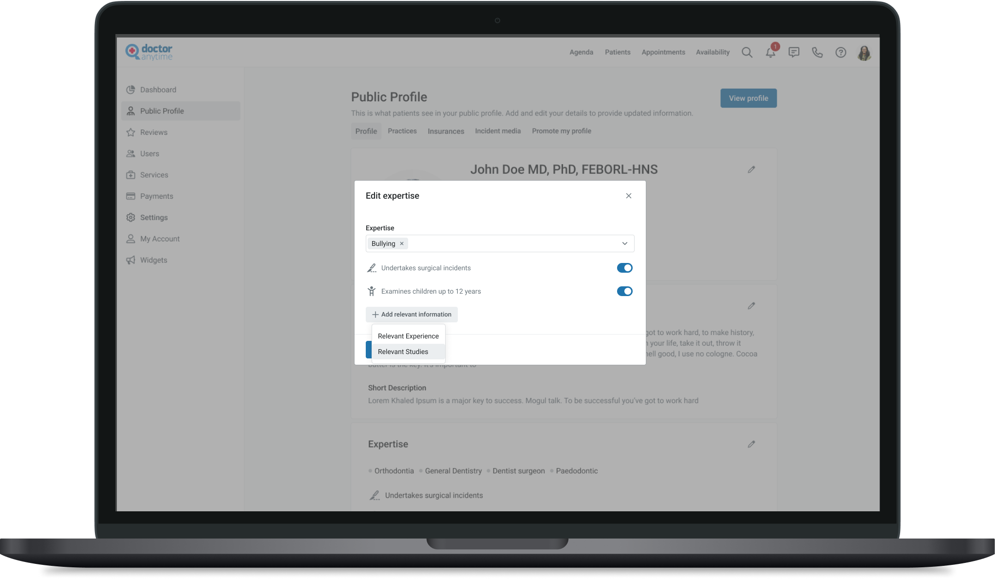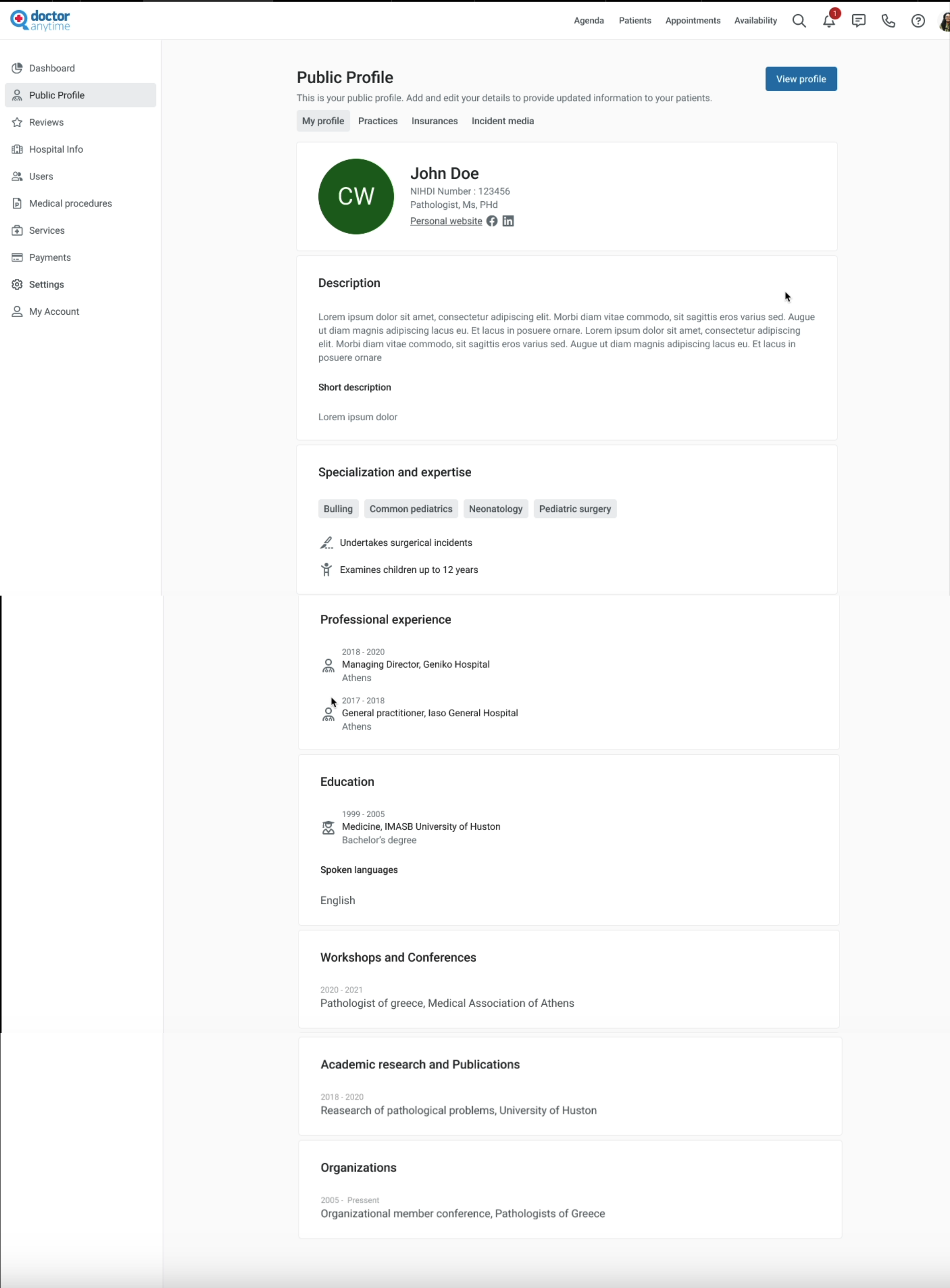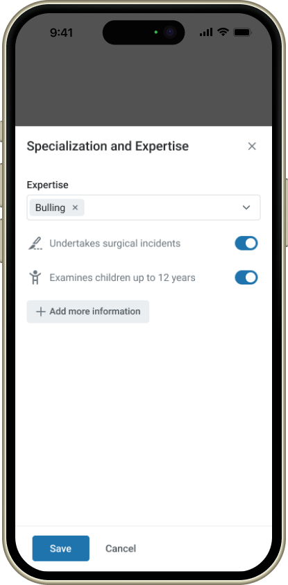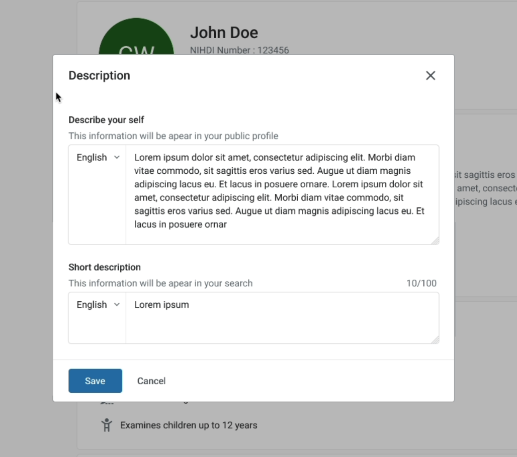 the doctor will be able to add where exactly they specializes and specific information related to their specialty
