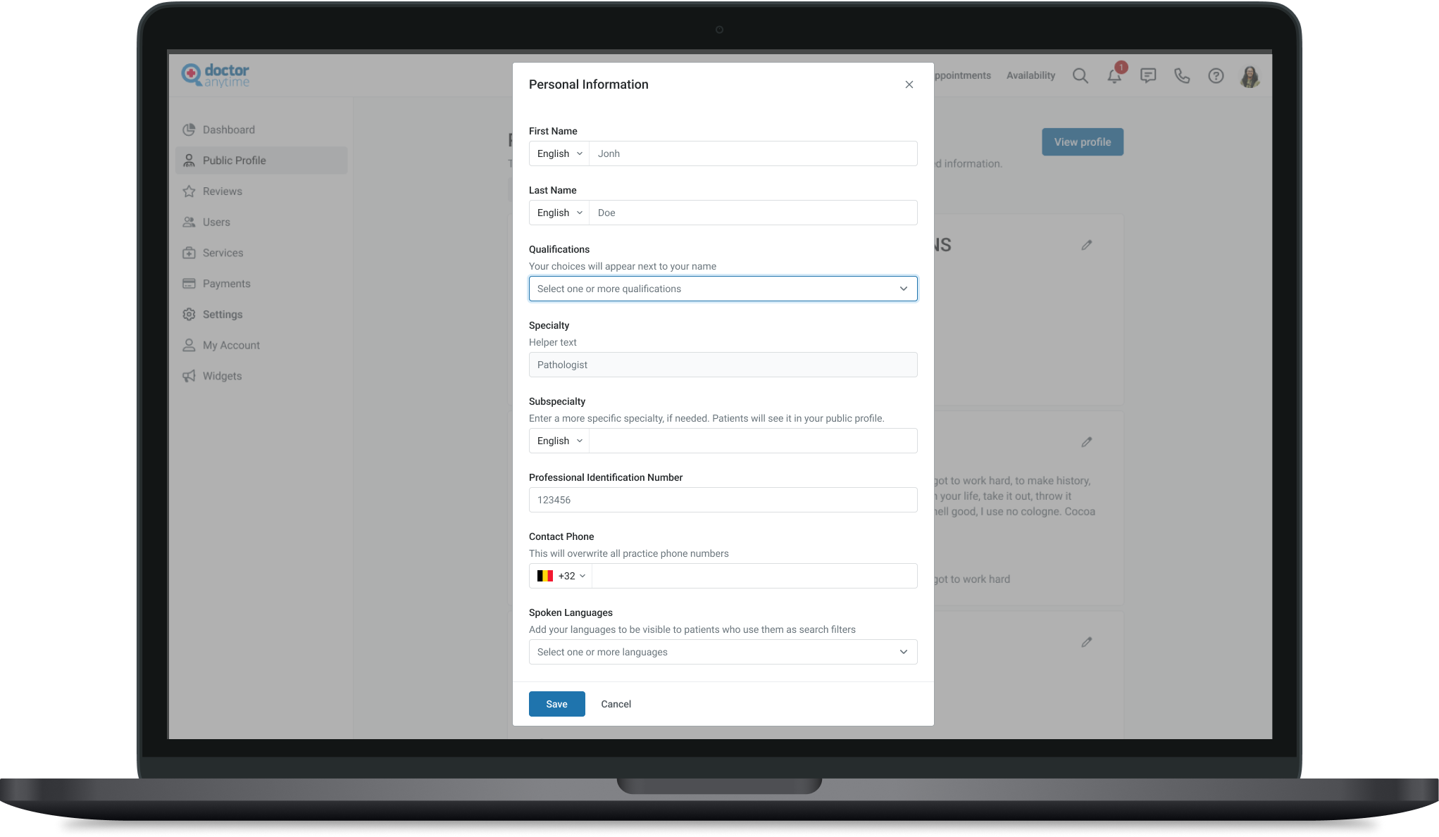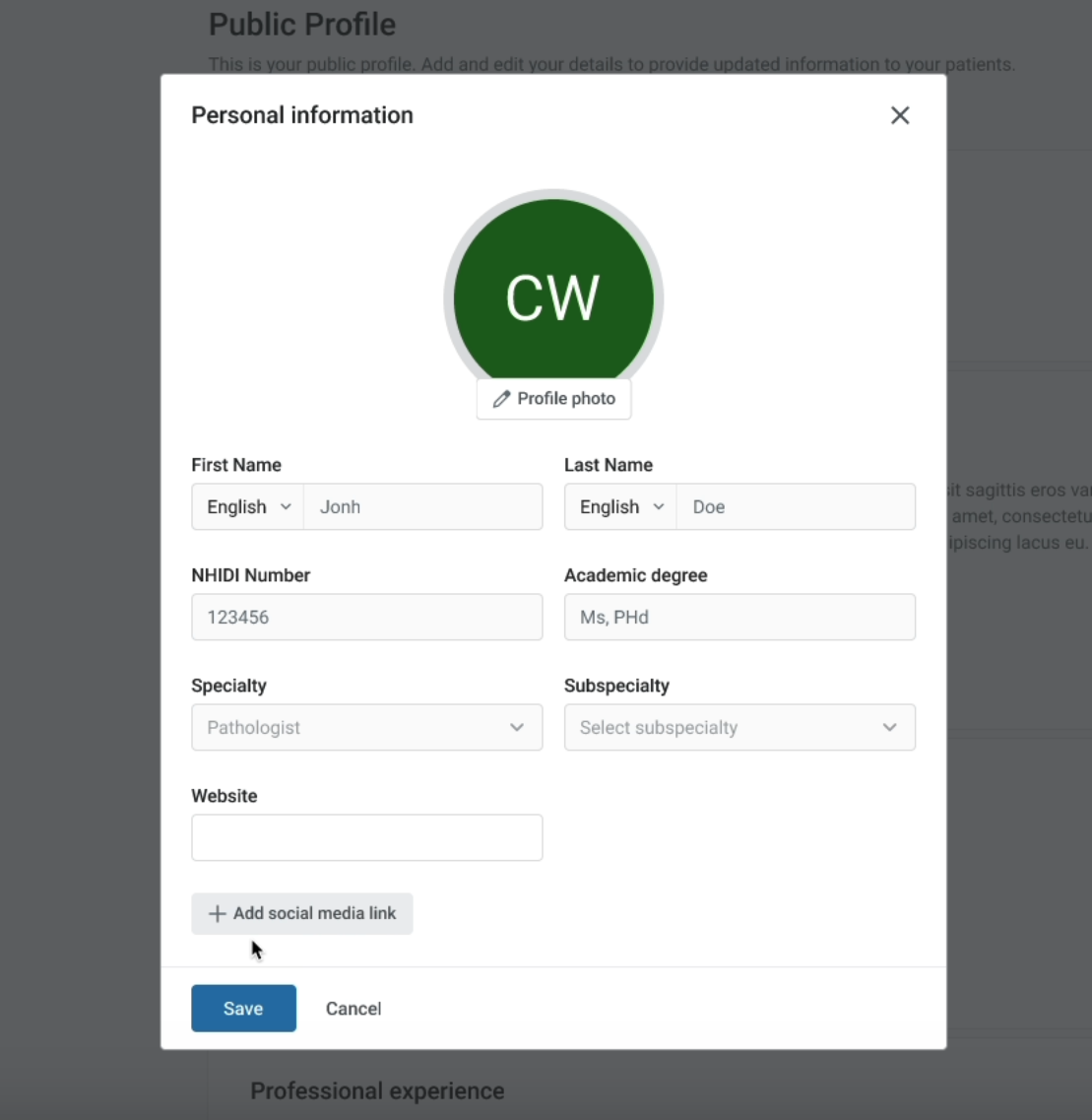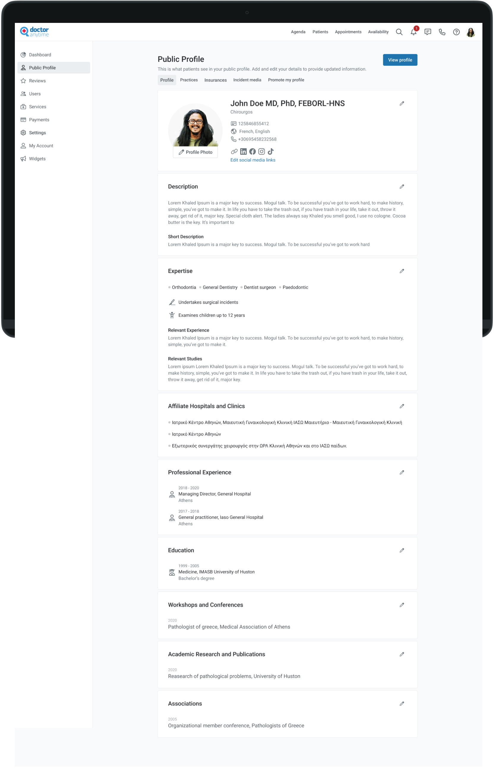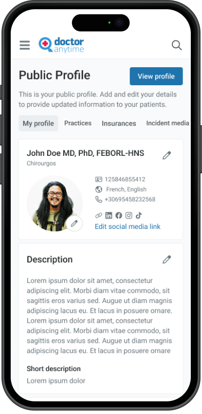 the doctor will be able to modify his personal information such as name, surname, academic degree, specialty, subspecialty and to add social media links (instagram, tik tok, Linked in etc.)