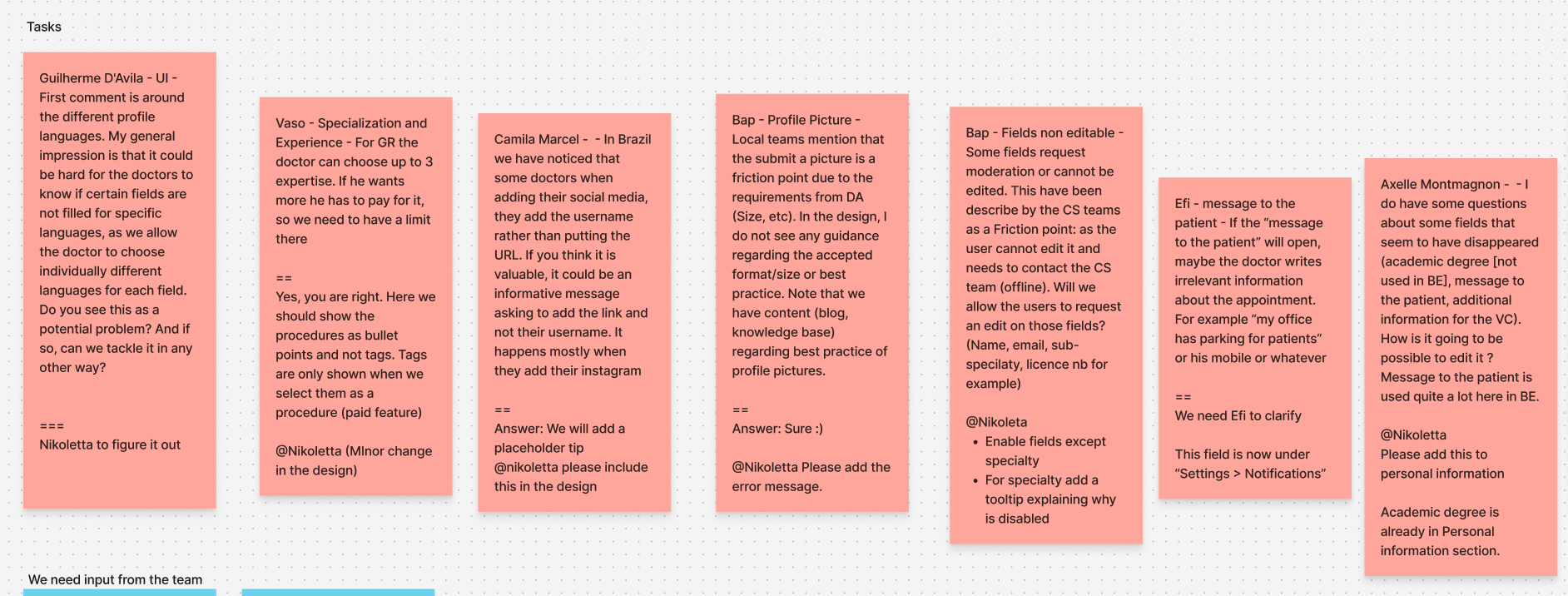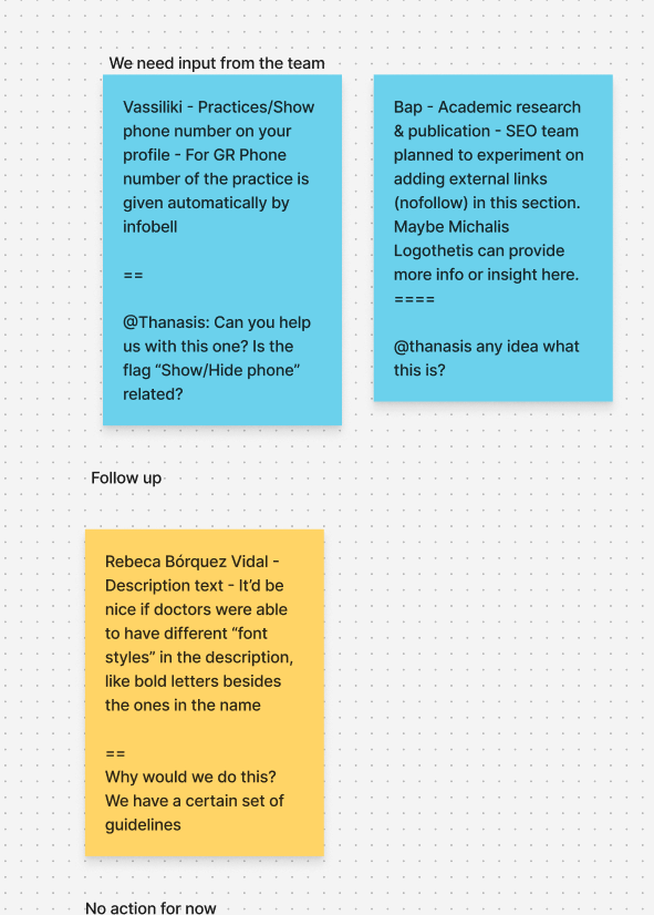 we organized the comments into specific categories. Tasks that needed to be completed for the first release were marked with red notes. Items requiring additional technical information were tagged with blue notes. Follow-up actions were highlighted with yellow notes, and suggestions slated for the next release were categorized separately. This systematic approach allowed us to prioritize and address the feedback effectively.