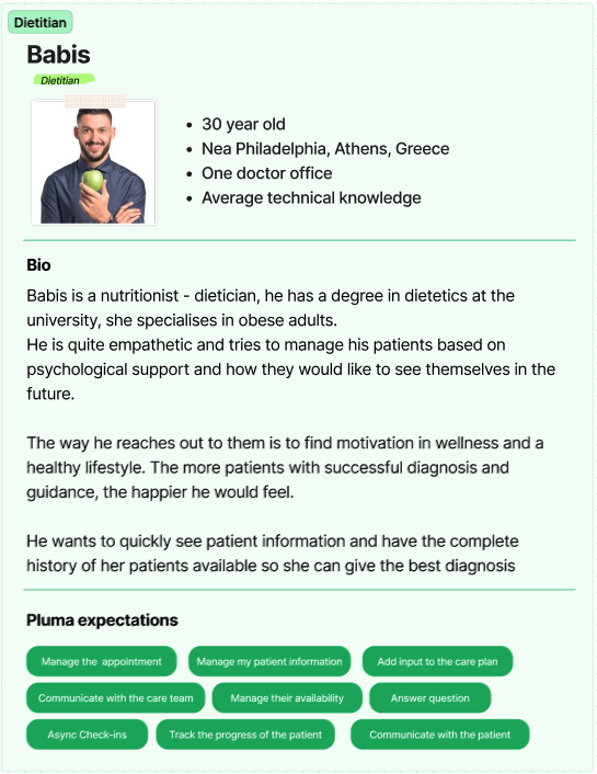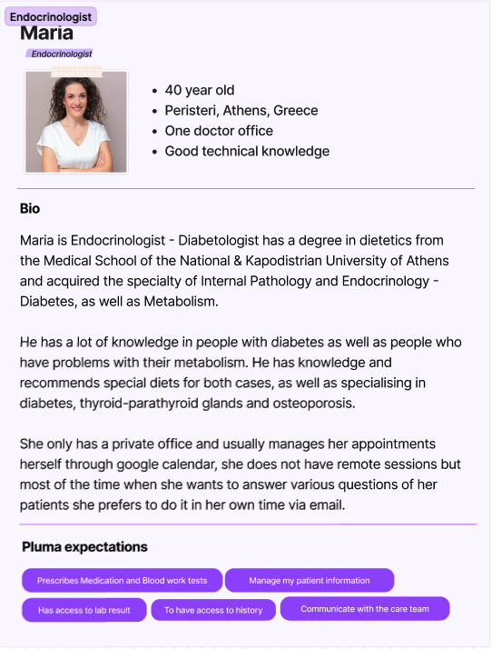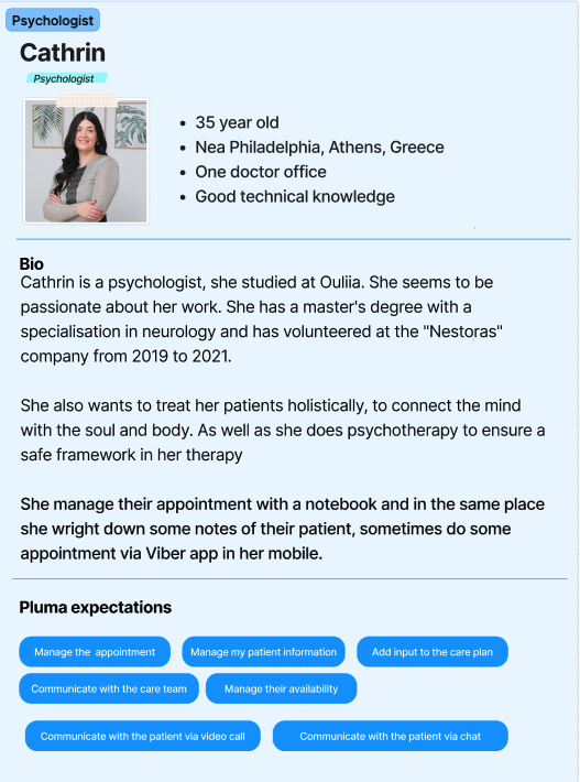 To better understand our target audience, we created detailed personas representing the users we aim to engage. We developed three personas, each tailored to the unique needs of different specialties. After outlining each persona, our primary focus was identifying the specific expectations they would have from Pluma.